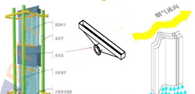 吸收塔均应装备除雾器,在正常运行状态下除雾器出口烟气中的雾滴浓度应该不大于75mg/m3。吸收塔除雾器一般设置在吸收塔顶部(低流速烟气垂直布置)或出口烟道(高流速烟气水平布置),通常为二级除雾器。吸收塔除雾器设置冲洗水,间歇冲洗冲洗除雾器。湿法烟气脱硫采用的主要是折流板除雾器,其次是旋流板除雾器。